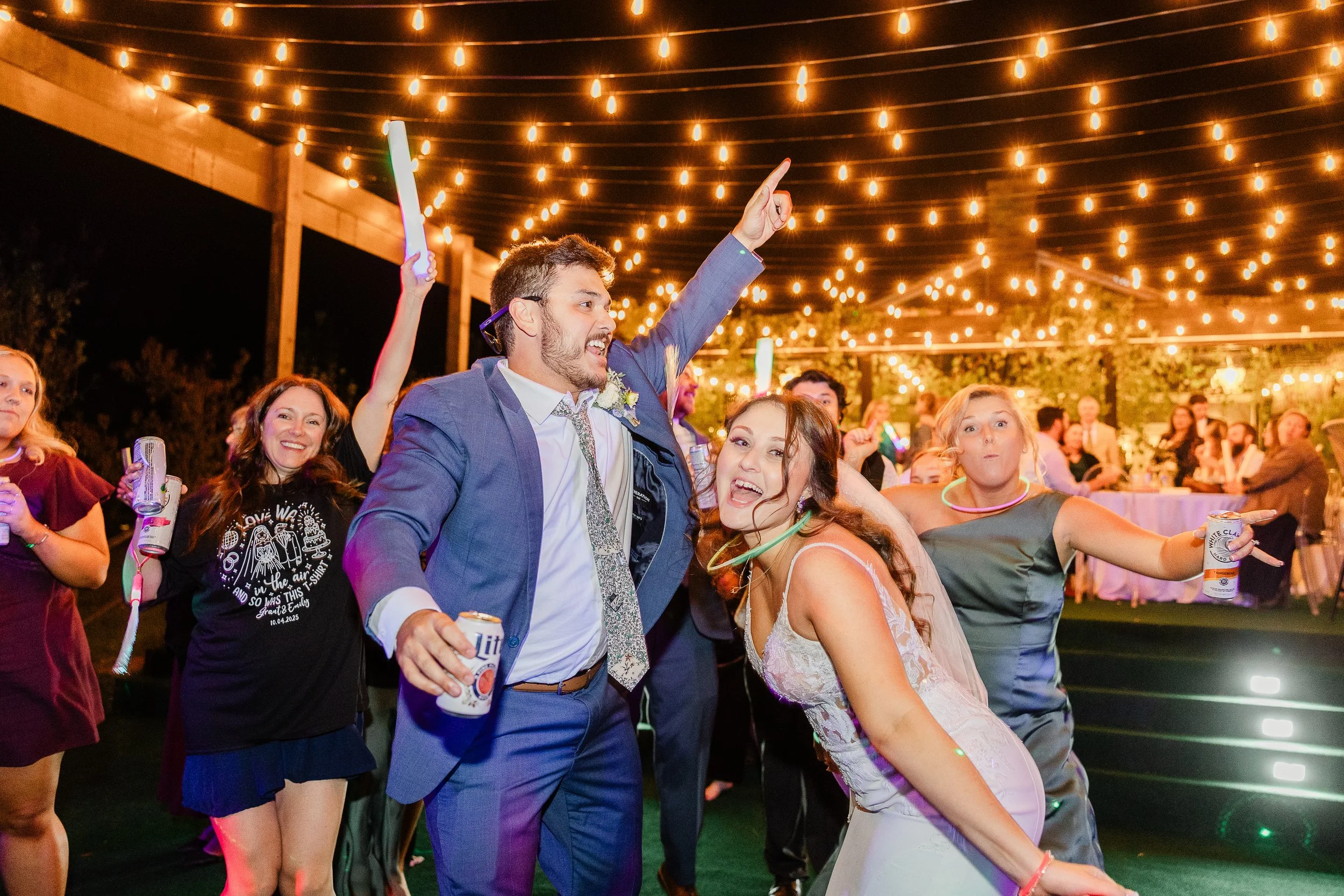 Grant and Emily brought the fun in ways that had guests fully invested: a glow moment on the dance floor that turned the reception into a full-on glow party, plus a t-shirt toss that had people cheering like it was a championship game. Cypress and Sage coordinated the timing with DJ Hood and the vendor team so the glow moment and t-shirt toss hit at the right time, kept the room energized, and didn’t interrupt dinner, toasts, or key transitions. It was playful, unexpected, and exactly the kind of detail that keeps energy high all night.